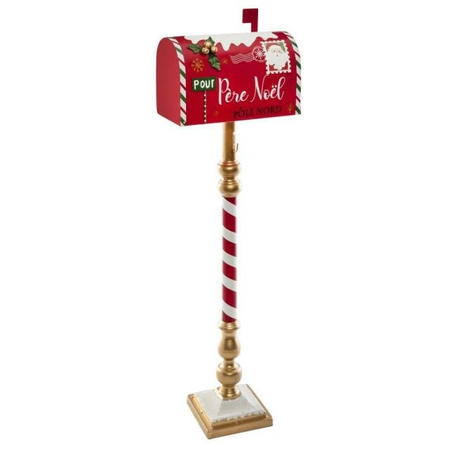 De belle facture en métal solide, elle se pose au sol (ou en vitrine) grâce à son socle bien stable : vous pourrez la placer et la déplacer au gré de vos besoins et donner libre cours à votre imagination. Quant à son pied, élégamment doré et strié de rouge et blanc, façon “sucre d’orge”, il ajoute une touche de gaieté. Cette boîte aux lettres sera donc bienvenue dans un univers gourmand (pâtisserie, confiserie). Et elle conviendra particulièrement bien dans notre concept déco “Noël Gourmand”, mis au point par nos experts en merchandising : en suivant ces recommandations, vous créerez un univers de fête bien à vous, qui vous différencie des autres commerces. Boîte aux lettres en métal. L. 33 x P. 18 x H. 100,5 cm.