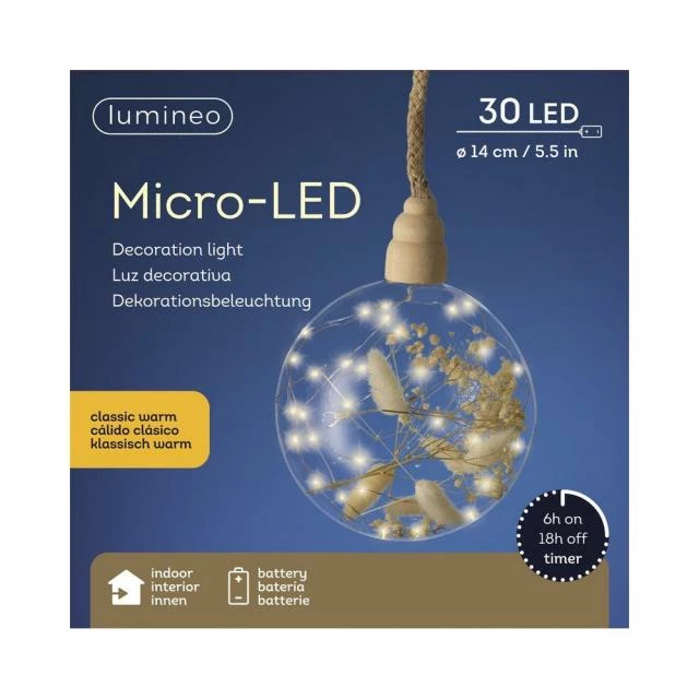 Dotée de micro LED, cette boule de très haute qualité de finition introduit un esprit “nature cocoon” qui donnera plein d’élégance et de féérie à vos mises en scènes : en effet, elle renferme une poignée de fleurs sauvages et des micro LED. Ceux-ci sont programmables grâce à leur minuteur. Quand vous l’allumez, le spectacle est vraiment merveilleux : une alliance magique de tons champêtres et de lumière diaphane. Par sa cordelette en jute, vous la suspendrez facilement au plafond, ou à toute autre structure de votre mobilier. En vitrine ou à l’intérieur de votre commerce, elle captera inévitablement les regards de vos client(e)s. Elle est idéale pour attirer l’attention sur un point spécifique de votre espace et tout particulièrement les produits que vous souhaitez mettre en valeur. Plantes naturelles (sétaire verte et gypsophile). 30 ampoules micro LED. Couleur LED : blanc chaud. Distance entre chaque LED 4,5 cm. Autonomie 72 h. Minuteur 6 h. Fonctionne avec 3 piles AAA, non fournies. Longueur du câble 1 m. Usage intérieur. Classe IP-20. Qualité CE. Diam. 14 x H 8 cm.
