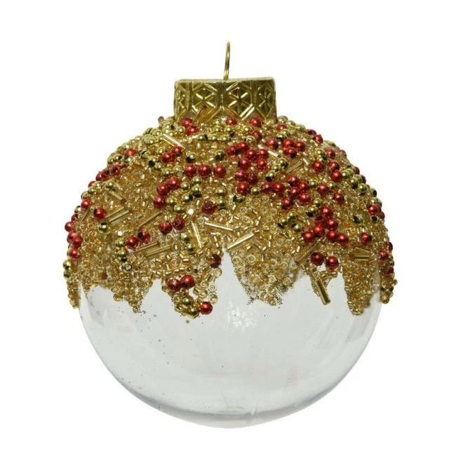 Cette boule incassable sera parfaite pour votre usage professionnel : elle ne craint pas les manipulations lors du montage/démontage et aussi en magasin, à portée du passage clients. Dans votre commerce, elle témoigne de votre goût pour les choses raffinées. Sa transparence et son sommet couvert de perles rouges et or lui donnent un aspect d’une infinie délicatesse. Par son attache dorée, vous la suspendrez facilement au plafond, à un arbre de Noël ou à toute autre structure de votre agencement. N’hésitez pas à en commander en nombre : ainsi, vous aurez le loisir d’en essaimer partout dans votre espace de vente. C’est l’idéal pour habiller tout votre magasin d’une ambiance festive et féérique, dans une parfaite cohérence. Diam. 8 cm.