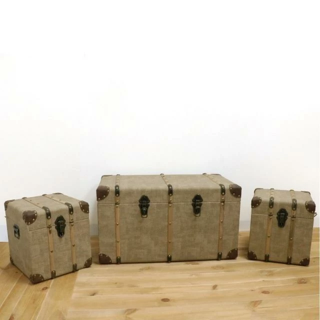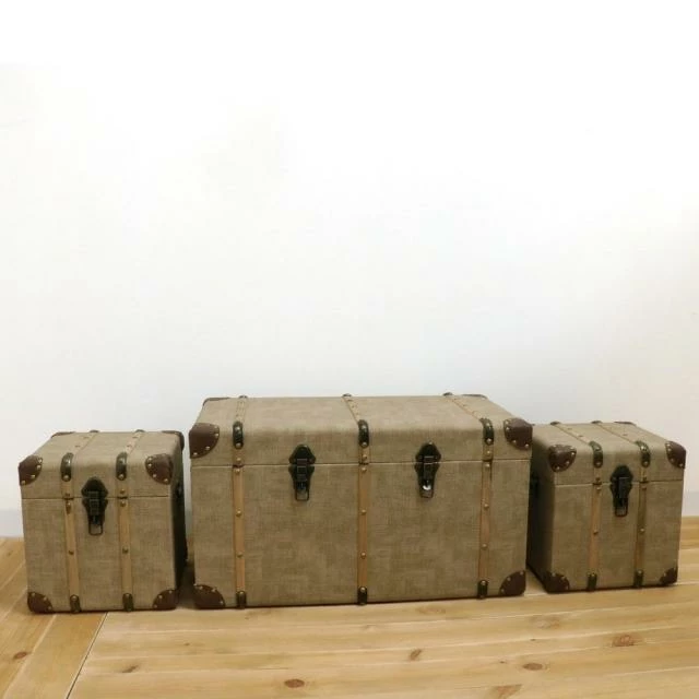 Une malle et deux petits coffres assortis : c’est un magnifique ensemble retro empreint de nostalgie des siècles derniers ! Il fait entrer l’âme des grands voyageurs dans votre espace de vente. Les coins cuir, les clous, les sangles de renfort, le système de verrouillage métal, les poignées latérales : absolument tout, dans les finitions, inspire la belle qualité d’ouvrage. Qu’elles soient fermées ou ouvertes, savamment étalées ou bien empilées, ces malles se prêtent à toutes vos idées de stylisme. Elles sont aussi fonctionnelles pour une présentation valorisante de vos produits que pour un rangement élégant en magasin. En vitrine, elles insufflent un esprit d’évasion et de voyage, parfait pour inviter à franchir votre pas de porte. La malle : L 66 x P 36 x H 36 cm ; les deux coffres : L 28 x P 28 x H 30 cm. En cuir PU et bois MDF.