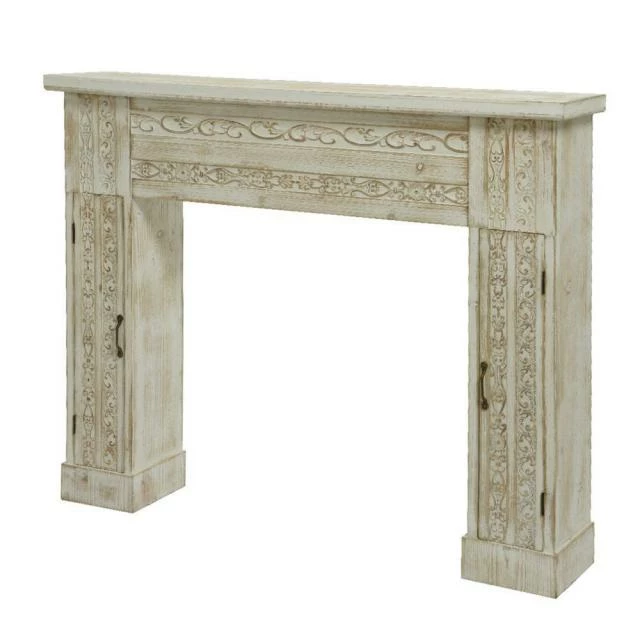Une fausse cheminée dans votre vitrine ou en zone centrale : rien de mieux pour donner de la hauteur à vos produits vedettes, particulièrement en période de fêtes (mais pas seulement !). Elle vous réserve de multiples possibilités : en effet, ses portes qui s’ouvrent sur les côtés contiennent chacune des tablettes à l’intérieur. En bois de sapin, elle renforce l’ambiance de tradition et d’authenticité que vous voulez donner à votre commerce. Bien robuste sur sa base, elle est dotée de ferronneries (poignées et gonds) empreintes d’une rusticité naturelle. Vous apprécierez tout particulièrement l’intense richesse des motifs sculptés sur les parois. En plus, sur ce bois blanchi, vos produits exposés se détacheront parfaitement ! L 120 x l 24 x H 101 cm.
