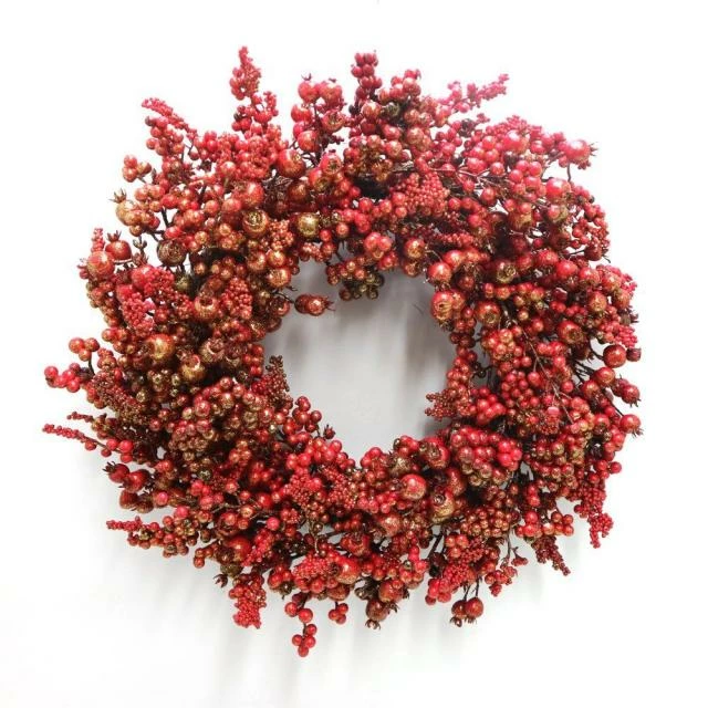 Cette couronne de branchages pailletés est constituée de baies rouges de diverses intensités, de divers volumes : cela renforce son réalisme naturel. A poser, à accrocher, selon vos envies, elle créera une ambiance champêtre et chaleureuse. Vous pouvez aussi jouer à entourer un produit vedette ou bien la poser au pied d’un de vos articles exposés. Dans tous les cas, la finition pailletée ajoute une belle touche de brillance festive. En zone murale ou posée à plat, elle remplira parfaitement son rôle : sublimer votre mise en scène de produits, mettre en valeur des articles et attirer l’œil. Et, naturellement, vous laisse toute possibilité de la garnir de guirlandes, boules, sujets, fleurs et feuillages, selon le thème que vous voulez donner à votre décoration de Noël. Diam. 55 cm.