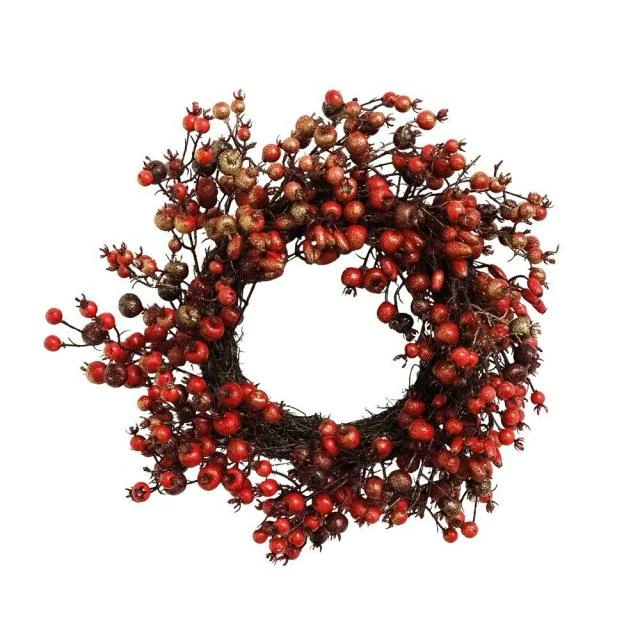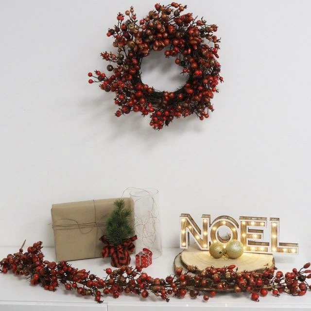 Vous pouvez également ajouter une bougie de saison pour créer un centre de table lumineux.couronne artificielles de baies rouges pailletées or à suspendre diamètre totale : 35cm