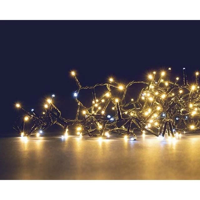 Pour l’animation de votre sapin (ou tout autre élément de votre commerce), vous pouvez faire confiance à la technologie LED. Vous aurez la certitude de disposer d’une installation durable, adaptée à l’usage extérieur (et bien sûr intérieur), convenant parfaitement à des exigences de fiabilité professionnelles. Son système très élaboré associe 680 LED blanc chaud (tirant vers le jaune, donc plus reposants) aux 120 LED blanc pur “flash” (éclatants et intenses). Son minuteur vous offre jusqu’à 6 heures d’autonomie. A tout moment, la succession de “flash”,et les lumières permanentes plus douces, créeront à la fois la surprise et l’émerveillement. Au total, cela représente une constellation de 800 LED étalés sur 18 mètres ! Vous avez donc assez de longueur pour pouvoir envisager des illuminations de grande ampleur. Que ce soit devant ou à l’intérieur de votre commerce, l’effet est garanti ! Minuteur 6 H. Usage intérieur/extérieur. Taille des LED 3 mm. Alimentation secteur. 24 V. Câble coloris vert, Long. 18 m.