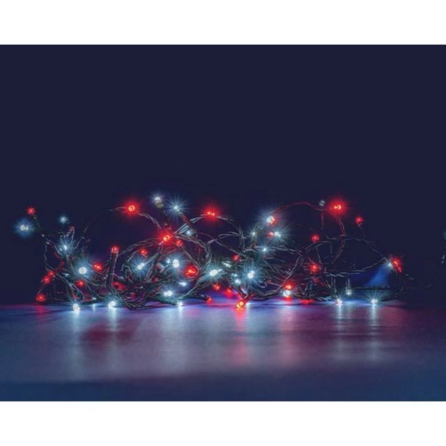 Guirlande flicker light® led bi colore blanc pur & rouge – longueur : 16m – 96 led blanc pur + 96 led rouge – animée 8 fonctions mémoire (7 animations + 1 fixe) – câble vert – 31v – 6w – usage intérieur & extérieur.