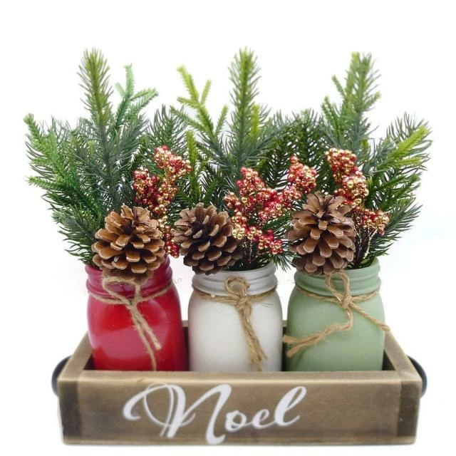 Réunis sur un présentoir en bois, ces 3 vases de branchages et pommes de pins de Noël évoquent en même temps la naturalité, l’authenticité et le côté “fait main”. Les pommes de pins et les feuillages semblent fraîchement ramassés dans les bois. Quant aux 3 vases assortis, ils rappellent l’aspect traditionnel des vieux pots anciens en grès. Et la touche finale, ce sont ces délicates cordelettes de jute qui les entourent : elles semblent nouées à la main avec le plus grand soin. Assurément, c’est une décoration pleine de charme qui ne manquera pas d’attirer l’œil dans votre vitrine, ou n’importe où dans votre espace de vente : en effet, ce joli trio floral sera aussi idéal pour rendre accueillante votre zone caisse. Dim. 28 x 11 x 6,5 cm.
